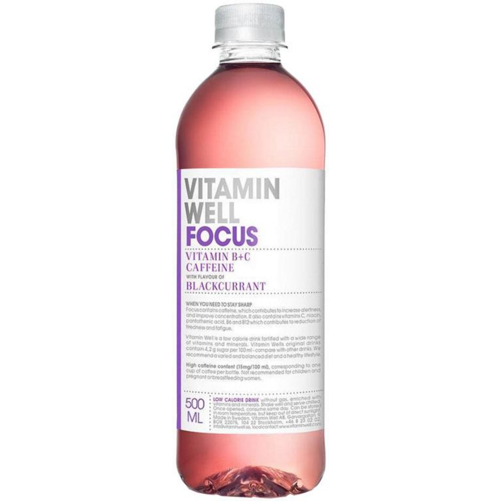 Focus contient vitamines B et vitamine C qui sont essentielles pour le métabolisme énergétique. Cette boisson contient aussi de la cafeine qui contribue à la réduction de la fatigue. Vitamin Well est une boisson faible en calorie enrichie en vitamines et minéraux. Eau de source, fructose: d'acidité (acide citrique, citrates de sodium): niacine, B6, B12, biotine, acide pantothénique) thé vert, caféine, conservateur, arôme cassis, jus de sureau.